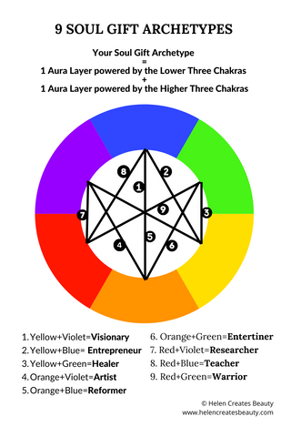 Please note that YOUR SOUL GIFT ARCHETYPE CAN CHANGE overtime, especially when you've done the spiritual work to heal your Soul Wound and learn your Soul Lessons, they will become your strength! Then you can exercise free will to combine any aura layer (one from the lower three chakras and one from the higher three chakras) and shapeshift into a difference archetype.